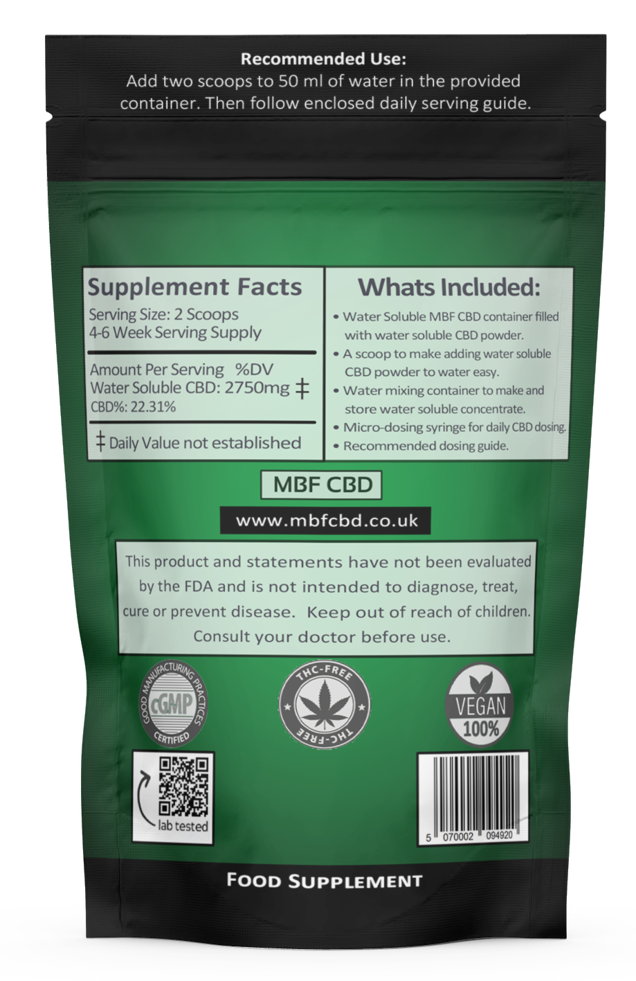 MBF CBD is a broad spectrum water soluble CBD powder which contains no THC but does contain other benificial cannabinoids so you can benifit from the entourage effect.